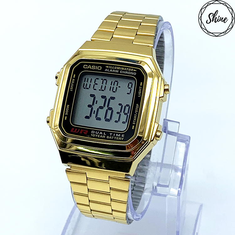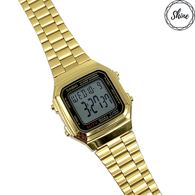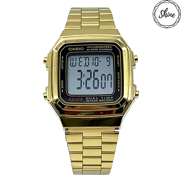 CASIO A178WGA以方型極簡造型設計,不鏽鋼錶帶呈現出獨有質感,全系列具備生活防水、1/100秒計時碼表、鬧鈴、LED背光照明、全自動月曆、12/24制切換等多項功能。