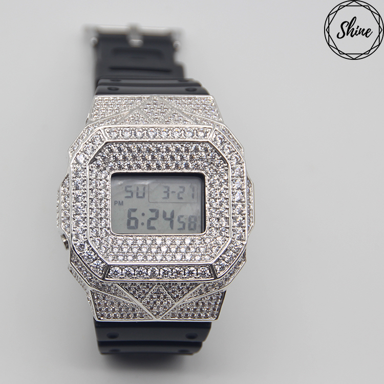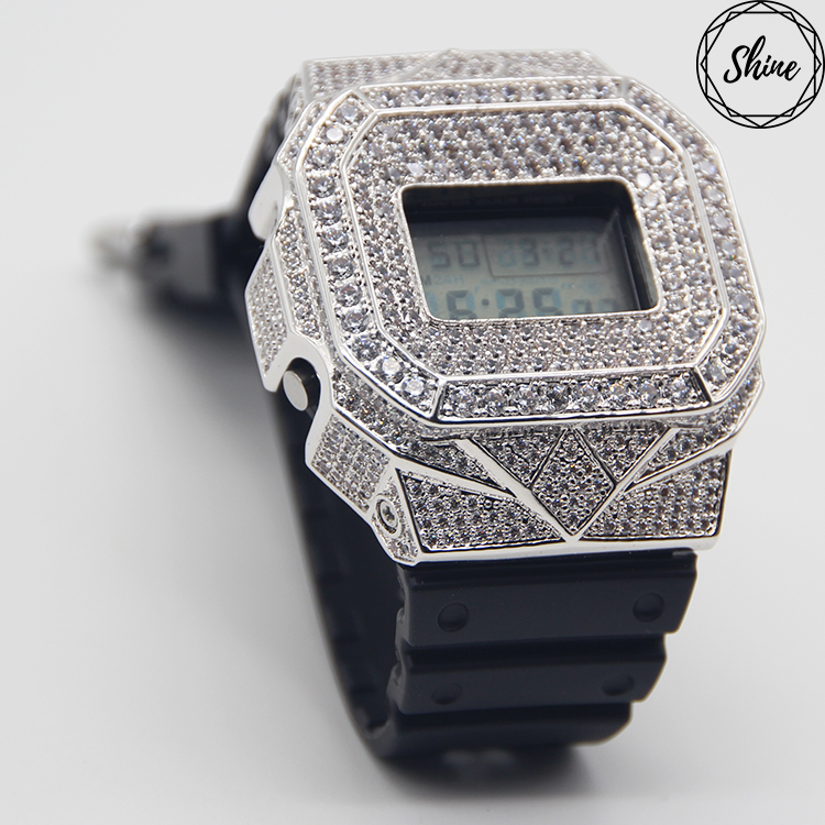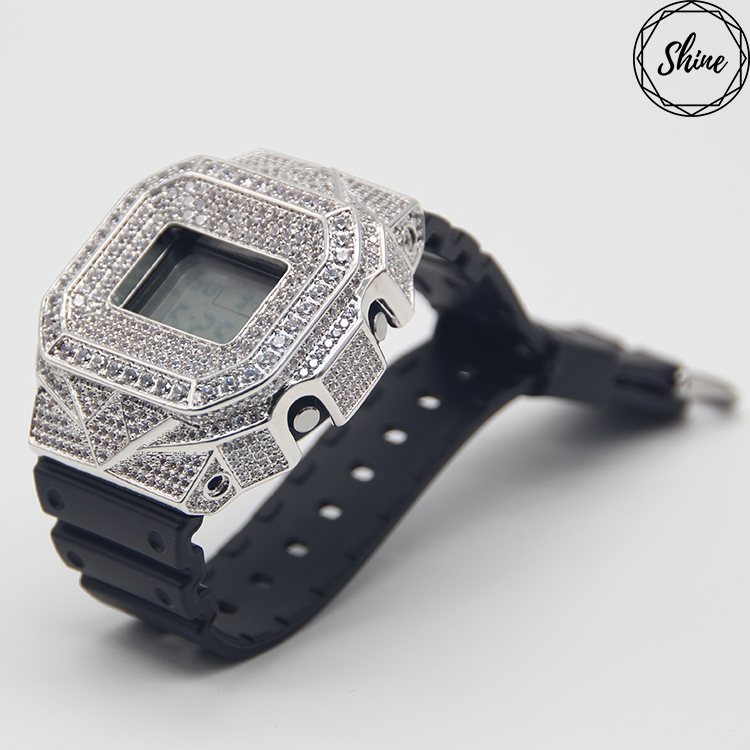 客製 DW-5600 方塊銀X白閃石鑲石金屬錶殼