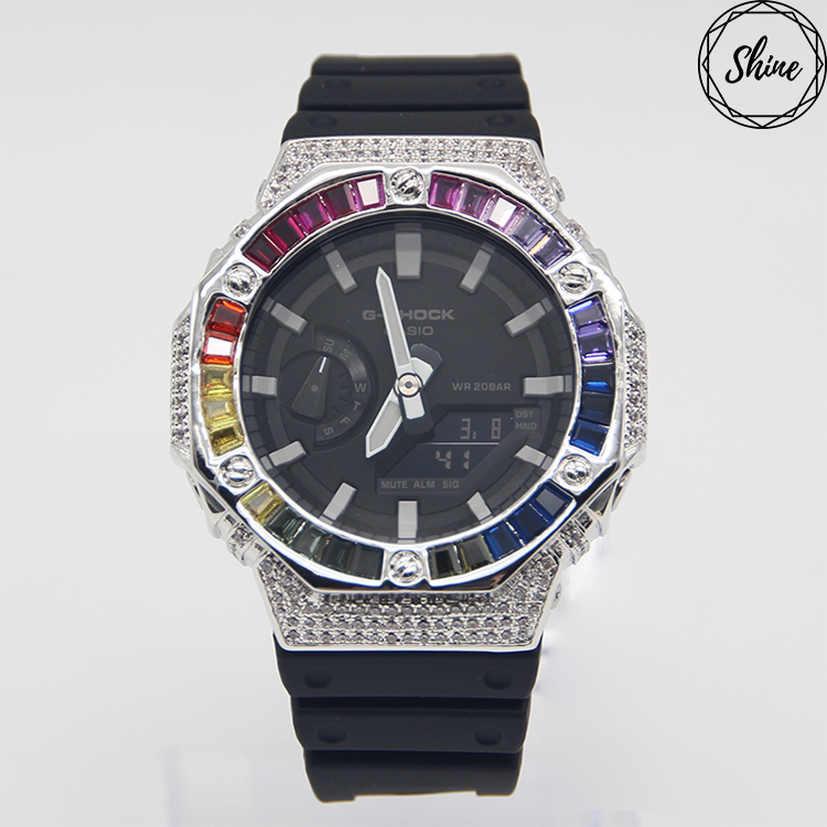 客製 GA-2100 銀X白石彩虹閃石金屬錶殼